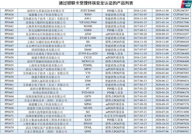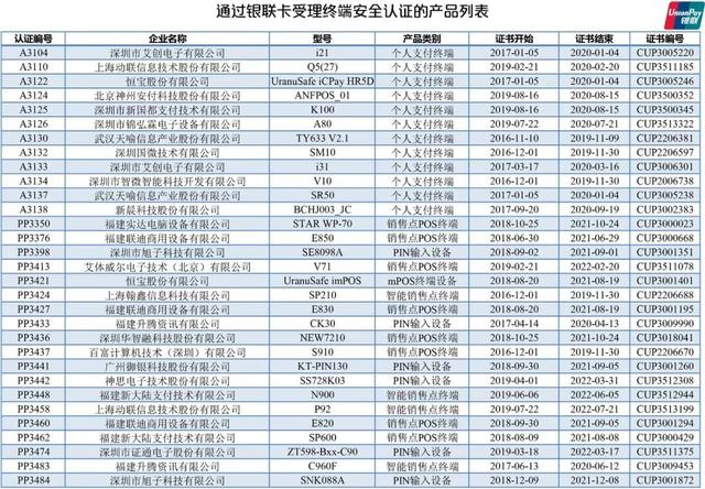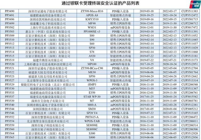 文章導(dǎo)讀:中國銀聯(lián)官網(wǎng)更新了【通過銀聯(lián)卡受理終端安全認證的產(chǎn)品列表】。銀聯(lián)卡受理終端設(shè)備指的是能完成銀聯(lián)卡交易的受理設(shè)備及其安全組件,包括但不限于電話支付終端、mPOS終端、金融自助終端,智能銷售點終端以及其他新型終端產(chǎn)品及PIN輸入設(shè)備等終端安全組件。