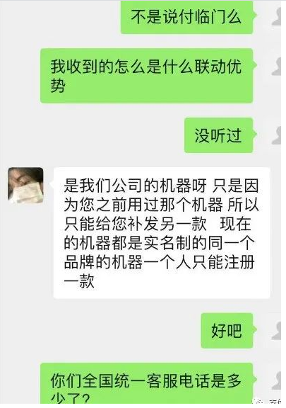 自稱客服和用戶聯系,說要郵寄付臨門的機器,收到的卻是聯動優勢的機器。客服解釋同一個品牌的機器一個人只能注冊一款!