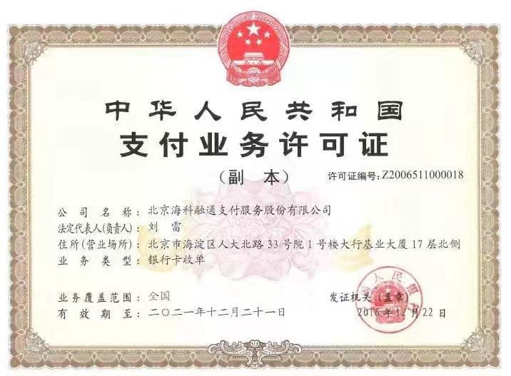 刷新支付POS機有支付牌照嗎?北京海科融通支付服務股份有限公司成立于2001年4月。海科融通持有中國人民銀行頒發的全國范圍內銀行卡收單業務類型《支付業務許可證》,擁有全國范圍內經營第三方支付業...
