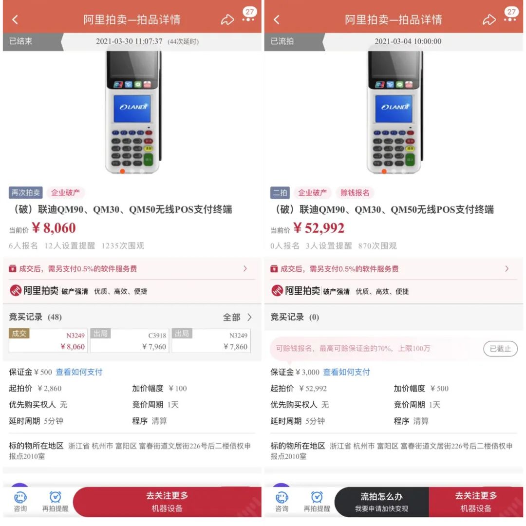 除此之外,小編發(fā)現拍賣價格最高的要數下面這個390臺的聯(lián)迪掃碼設備,原起拍價52992元,后二次拍賣,最終成交價8060元,平均20元/臺,拍到的人絕對血賺。