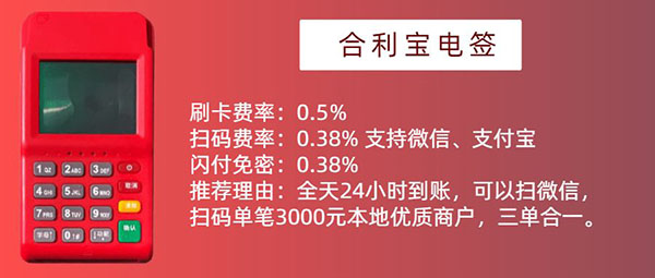 2.使用合寶pos機(jī)掃碼費(fèi)率為0.38%,不過這個(gè)0.38%需要支付在1000元以內(nèi)才是按照這個(gè)費(fèi)率標(biāo)準(zhǔn)進(jìn)行收取www.09847.com,超過的話就是按照正常的費(fèi)率進(jìn)行收取。