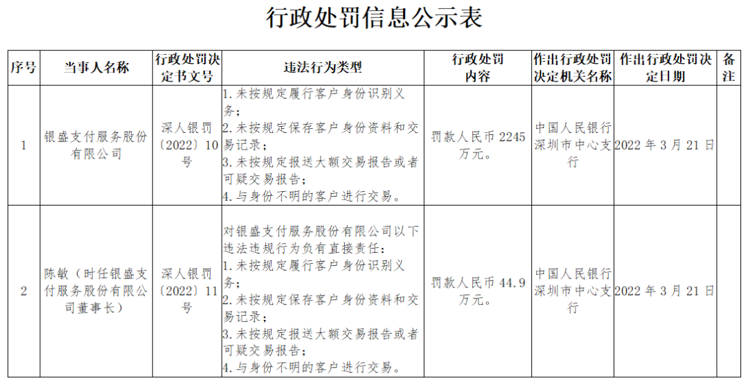 此外,行政處罰決定書(shū)(深人銀罰〔2022〕11號(hào))顯示,時(shí)任銀盛支付服務(wù)股份有限公司董事長(zhǎng)陳敏對(duì)上述違法違規(guī)行為負(fù)有直接責(zé)任,中國(guó)人民銀行深圳市中心支行2022年3月21日對(duì)其罰款人民幣44.9萬(wàn)元。