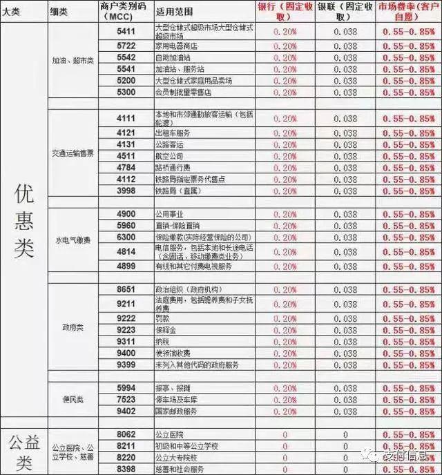 有的機(jī)器前五分鐘刷卡在北京,五分鐘之后刷卡在西安,這是不合理的。商戶類別碼顯示的是刷卡費(fèi)率,如果你刷的都是優(yōu)惠類及公益類,銀行是不賺錢的,對(duì)用卡人來講,是不利于用卡提額的。以下是部分費(fèi)率表,可以對(duì)應(yīng)查詢刷卡費(fèi)率是多少。