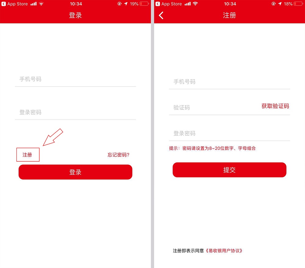 打開易收銀APP點擊注冊 進(jìn)入注冊界面 進(jìn)行注冊