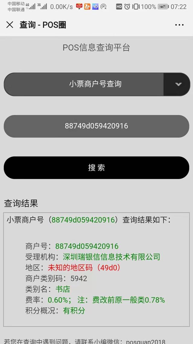 第三,微信關(guān)注POS支付網(wǎng),在查詢系統(tǒng)里選擇小票商戶號(hào)查詢,輸入商戶號(hào),一目了然,虛假商戶會(huì)顯示紅色的 [未知的地區(qū)碼(49D0)],如下圖。
