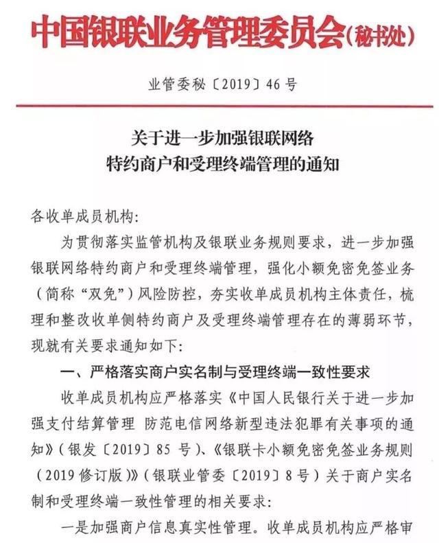 今日起,關(guān)閉所有大pos平臺的小額雙免交易,真實(shí)執(zhí)照進(jìn)件的商戶不受影響。如用戶在我司傳統(tǒng)POS終端使用云閃付小額雙免時提示:響應(yīng)碼40 ,請讓商戶進(jìn)行刷卡或插卡交易。此前,銀聯(lián)曾發(fā)布《關(guān)于進(jìn)一步加強(qiáng)銀聯(lián)網(wǎng)絡(luò)特約商戶和受理終端管理的通知》,要求收單成員機(jī)構(gòu)應(yīng)嚴(yán)格審核商戶資料,采取有效措施核實(shí)商戶經(jīng)營真實(shí)性與合法性。按照“應(yīng)注冊、盡注冊”原則,在銀聯(lián)商戶平臺準(zhǔn)確填報相關(guān)商戶信息,做好注冊登記工作。收單成員機(jī)構(gòu)應(yīng)落實(shí)《關(guān)于加強(qiáng)小額免密免簽商戶注冊登記的通知》要求,對小額雙免商戶注冊登記情況進(jìn)行排查,并按計劃進(jìn)行補(bǔ)注冊工作。 《通知》稱10月下旬左右啟用雙免交易白名單核驗(yàn)功能。重申為了防范網(wǎng)上買賣POS機(jī)、刷卡器等受理終端,加強(qiáng)外包機(jī)構(gòu)管理,嚴(yán)禁外包機(jī)構(gòu)利用網(wǎng)絡(luò)渠道售賣受理終端。