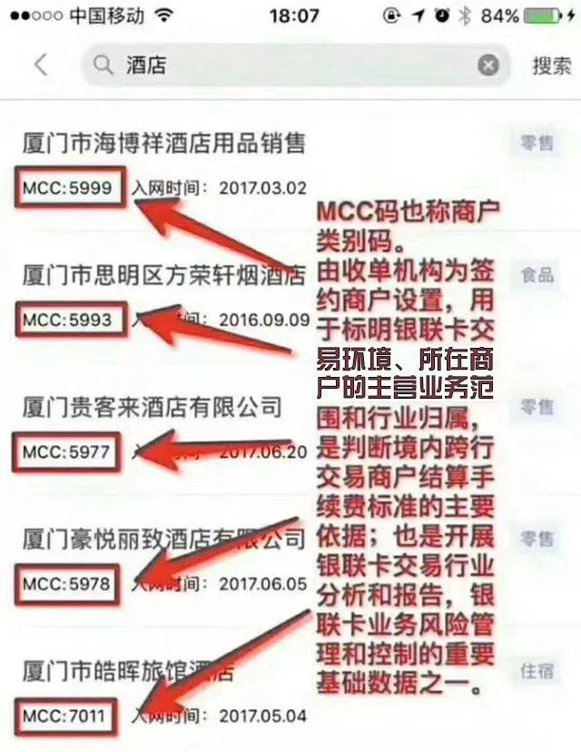 商戶類型碼(通稱MCC,MCC碼)四位大數(shù)字編碼構(gòu)成。由三方支付平臺為簽訂商戶設(shè)定,用以標出銀聯(lián)信用卡交易自然環(huán)境、所屬商戶的主營范疇和制造行業(yè)所屬,是分辨地區(qū)轉(zhuǎn)賬交易商戶清算服務(wù)費規(guī)范的關(guān)鍵根據(jù);都是進行銀聯(lián)信用卡交易行業(yè)現(xiàn)狀和匯報,銀聯(lián)信用卡業(yè)務(wù)流程風(fēng)險管控和操縱的關(guān)鍵數(shù)據(jù)資料之一。