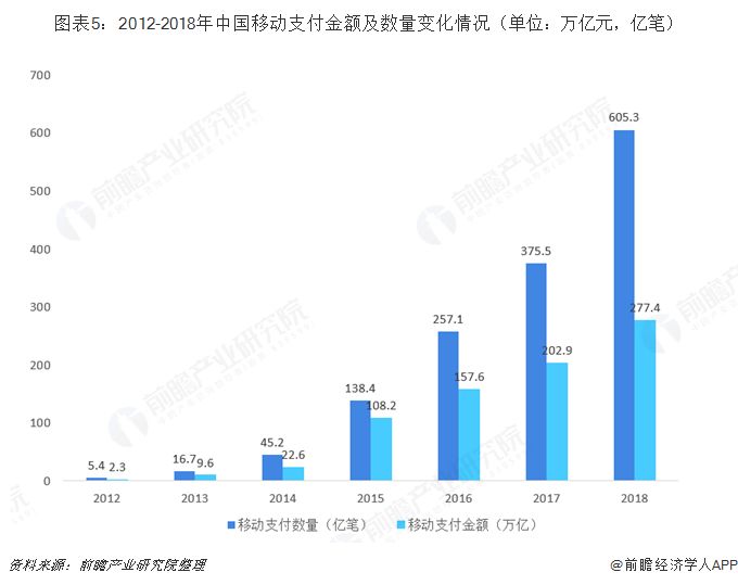 據(jù)中國支付清算協(xié)會(huì)最新數(shù)據(jù)顯示,2017年,中國移動(dòng)支付規(guī)模達(dá)202.93萬億元,全球排名第一,近五年移動(dòng)支付規(guī)模年復(fù)合增速高達(dá)117.6%;2018年,中國移動(dòng)支付業(yè)務(wù)605.3億筆,金額277.4萬億元,同比分別增長61.2%和36.7%。